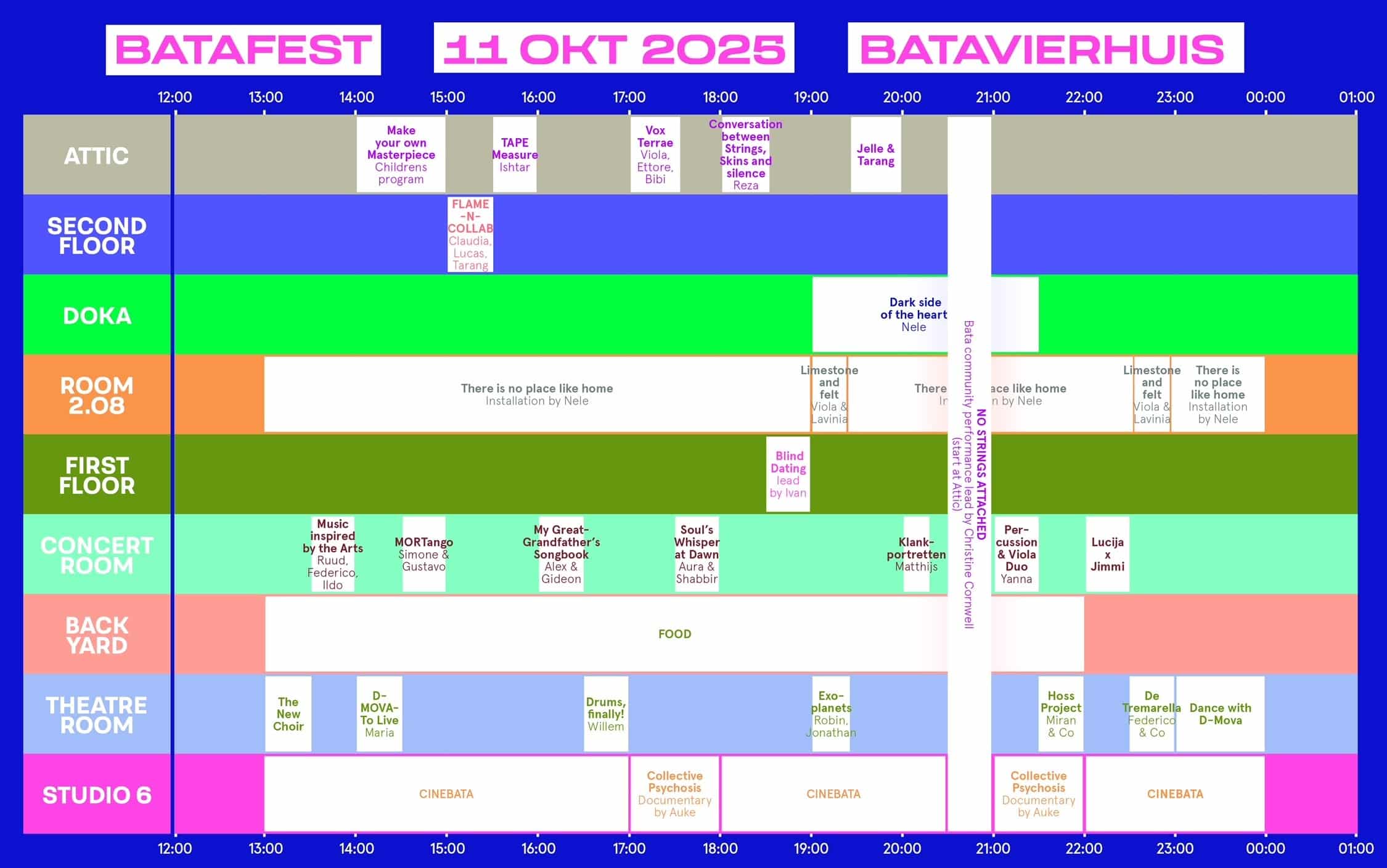 Van 13:00 - 00:00 start er steeds op een andere plek een nieuw mini-concert in het Batavierhuis. Er zijn doorlopend filmvertoningen en installaties te bewonderen.